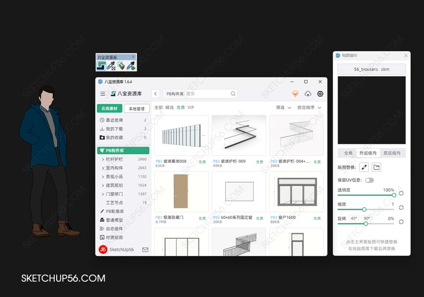 SK Model Box(八宝资源库)由国内作者八宝工作室开发,是一款在线模型库插件,插件自带本地模型管理器功能。PB3构件素材、动态组件是它的特色内容,拥有全网最多的PB3构件和轮廓,新版本新增普通模型版块、动态组件版块。