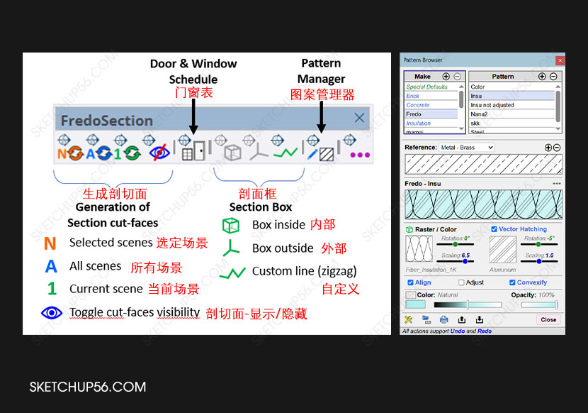 FredoSection (剖面填充)由Fredo6编写,终于还是来了,又多了一个解决剖面填充的利器,该插件有以下功能:为场景中活动的截面生成按比例缩放的剖面切割面,并添加阴影图案;为选定的几何体创建一组可配置的剖面平面(内框、外框、自定义剖面线);创建包含选定门窗视图的永久配套模型,然后可以在布局文档中按比例映射;此工具用于创建/修改填充图案,并将其分配给组和组件,以装饰由上述其他工具创建的切割面。FredoSection 内置了一系列图案,您也可以创建自己的图案。