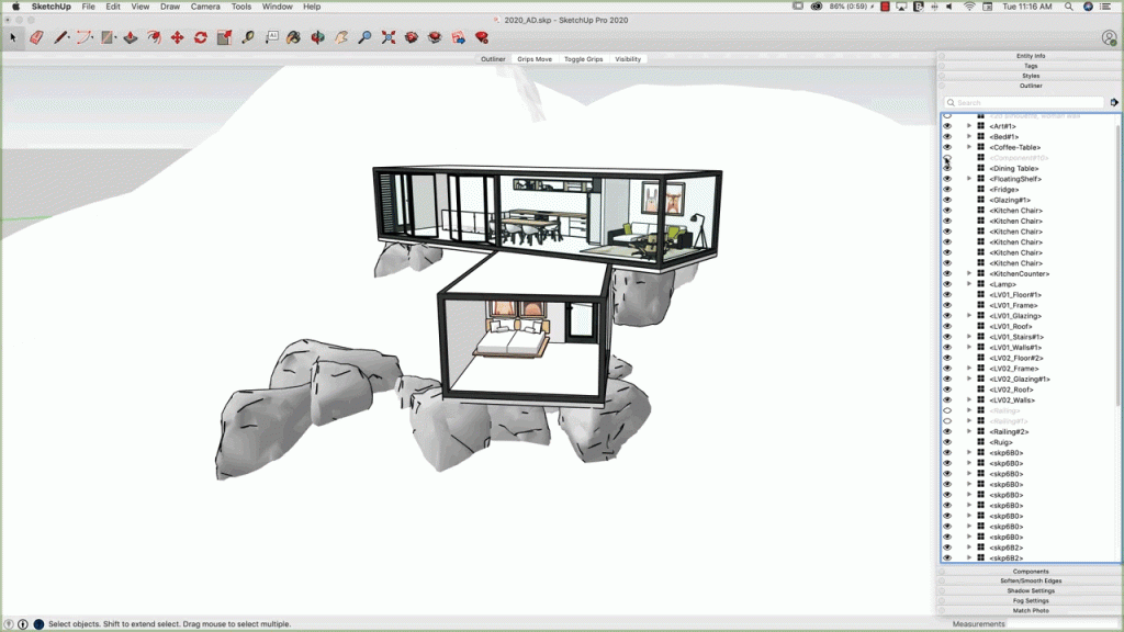 第一项增强功能可以让大型模型更加有条理:Outliner。 为了提高模型效率,您不再需要逐层创建图层。 现在您可以直接在Outliner中管理并组织模型。 点击便捷的眼球图标可以在模型的主要部分之间进行切换,例如主平面图和家具图层。